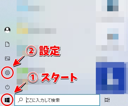 まず、パソコンのWindows画面の左下にある「スタート(Windowsマーク)」を選択し、次にその上に表示された「設定(歯車マーク)」を選択します。