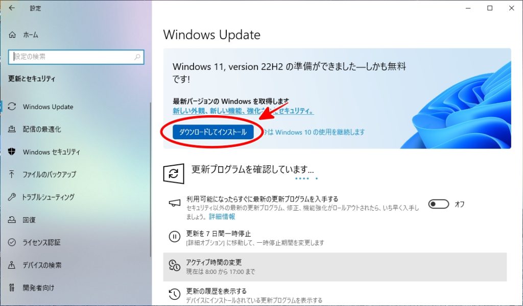 ここで、Windows11にアップデートできる条件を満たしているパソコンであれば、以下のように「ダウンロードしてインストール」というメニューが出ます。